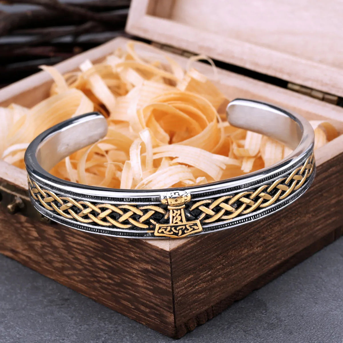 Indulge in the powerful allure of our Men's Stainless Steel Viking Hammer Cuff Bracelet, crafted with both gold and silver accents for a striking look. Constructed with strong stainless steel material, it exudes strength and masculinity, perfect for any Viking warrior. This cuff bracelet is designed for men who demand bold and fearless jewelry, making it an essential accessory.